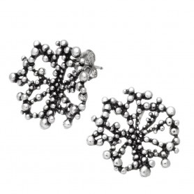 Texture di argento brunito e scaglie lucenti di serpente per questi iconici orecchini disegnati da Giovanni Raspini. Qui il tema stilistico con serpente arrotolato viene interpretato in termini figurativi, realizzando un gioiello avvolgente ed elegante.