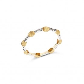 Elegante anello in oro giallo 18 kt e diamanti. La superfice dorata e irregolare, interamente incisa a mano dai nostri artigiani con uno speciale bulino millerighe, crea insieme ai diamanti un prodigioso gioco di luci da abbinare ad un look tanto elegante quanto casual.
