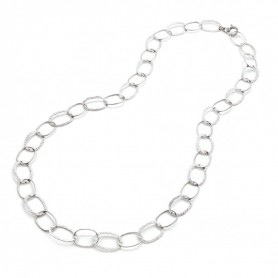 La collana è formata da maglie alternate di due diversi tipi: una sottile e lucida, l'altra in lastra martellata. Questa combinazione la rende molto brillante oltre che leggera. Chiusura a moschettone.