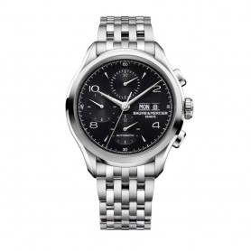 Questo cronografo Clifton, ref M0A10212, in acciaio inossidabile, presenta una cassa da 43 mm la cui forma a doppia lunetta ricorda un orologio Baume & Mercier degli anni '50. Animato da un movimento automatico di fabbricazione svizzera con funzioni giorno-data, è corredato da un cinturino in acciaio.