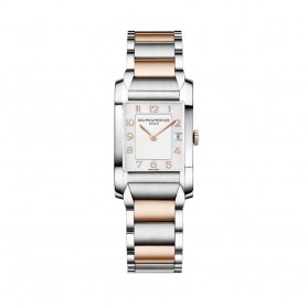 Baume & Mercier Hampton 10108 La linea Hampton abbandona l'estetica convenzionale, e si caratterizza per la forma rettangolare del quadrante. Questa collezione riprende le linee di un modello della collezione storica di Baume & Mercier realizzato in Art Déco vintage. Questo modello Hampton bicolor "Small" è dotato di cassa in acciaio e corona in oro rosso 18 carati