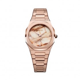 Abbiamo arricchito i nostri esclusivi quadranti con un pattern unico in marmo bianco e rosa, diverso su ogni orologio, a cui si fondono gli scintillanti indici in zirconi color rose gold a forma di diamante.